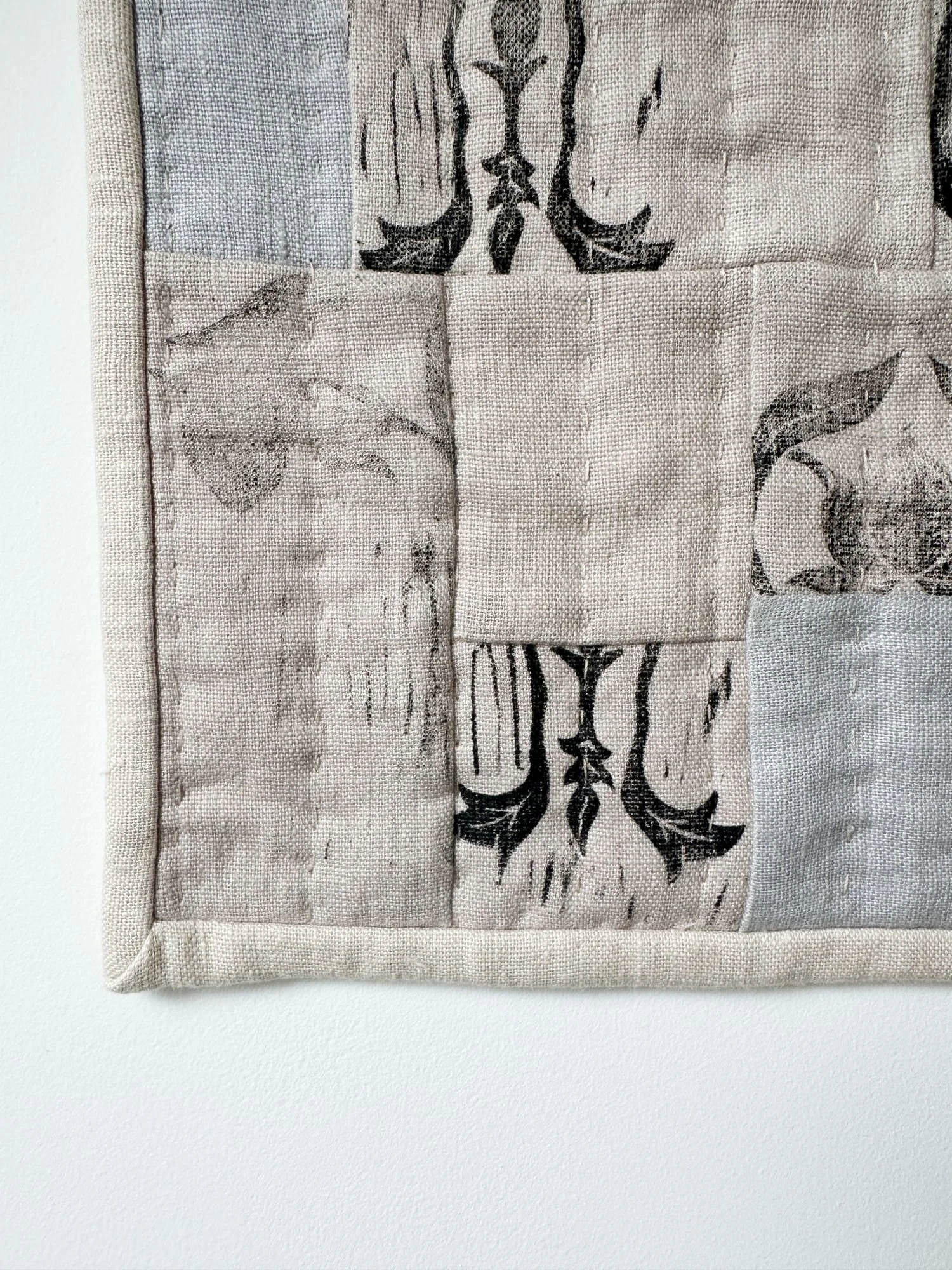 A patchwork wall hanging incorporating textured hand stitching. Includes hanging sleeve and dowel.